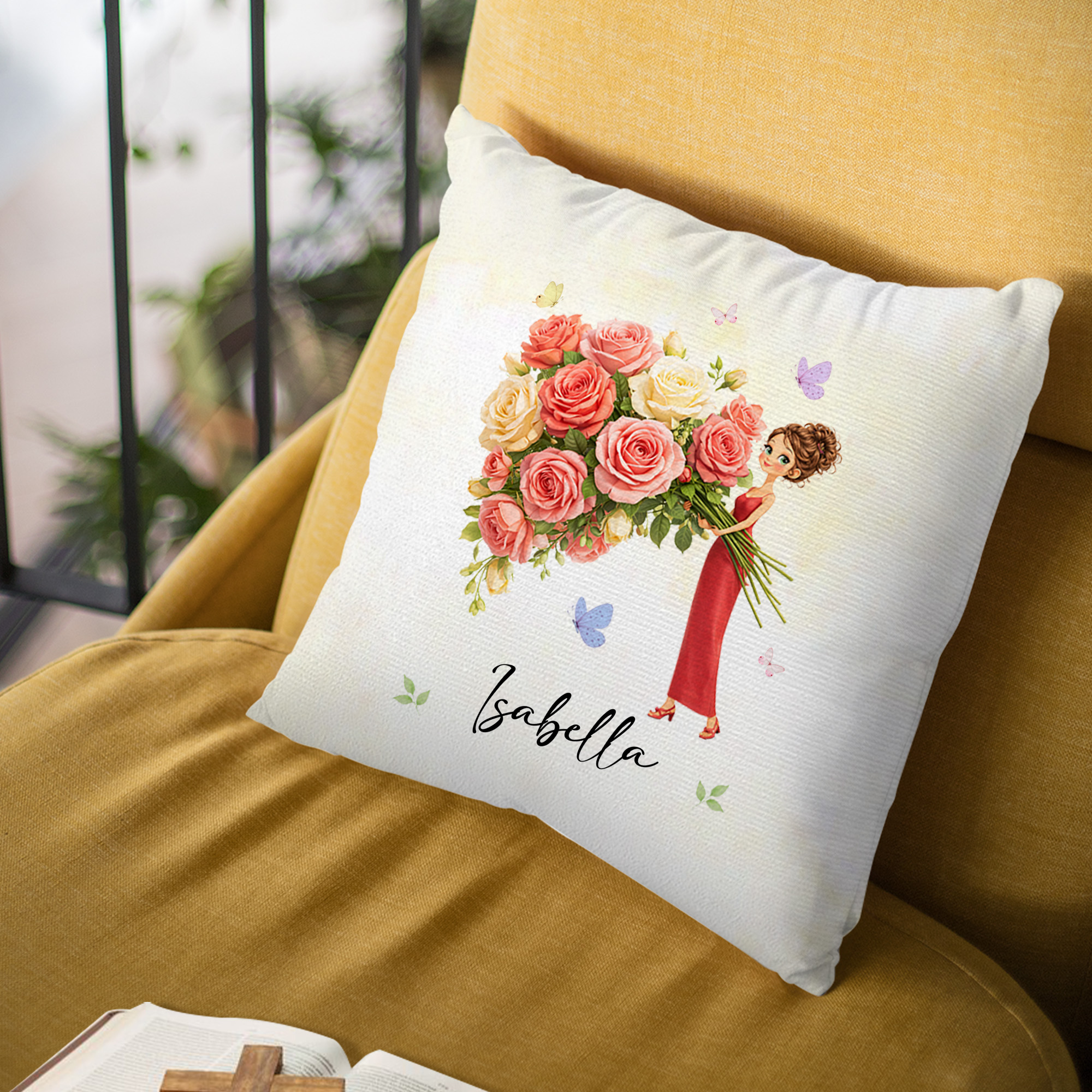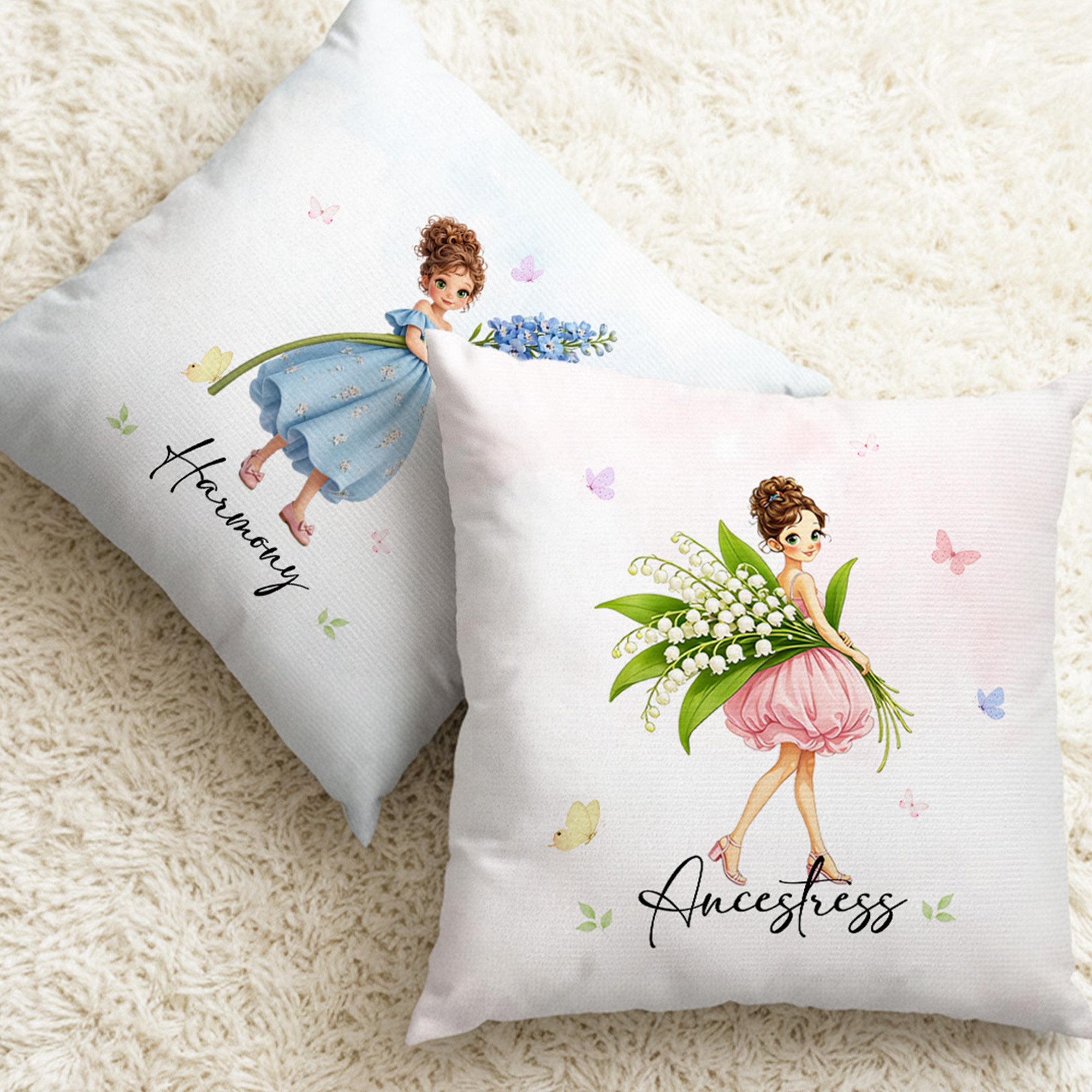 Whimsical Floral Design - This personalized throw pillow cover features a charming cartoon girl illustration paired with delicate birth flowers, fluttering butterflies, and a vintage-inspired style. The soft floral artwork brings warmth and personality to any room, creating a sweet and cozy accent for bedrooms, living rooms, or reading corners.